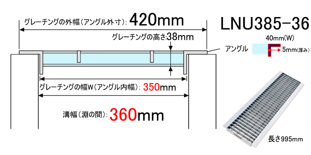 LNU385-36=360mm溝幅用になります、その他型式もお選び頂けます↓(販売金額・説明文・図面も連動で変わります):
